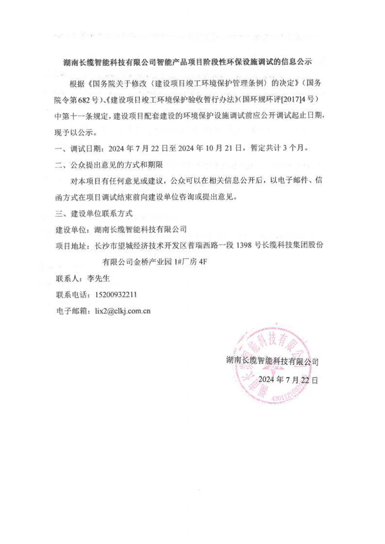 湖南合乐HL8智能科技有限公司智能产品项目阶段性环保设施调试的信息公示