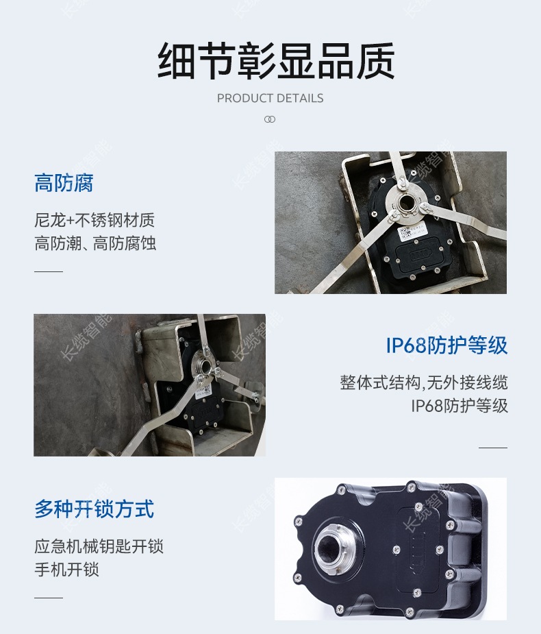 1. 锁体外壳采用尼龙加玻纤混合材料,锁栓、连杆采用304不锈钢材料,具有极高的防潮、防腐蚀能力;