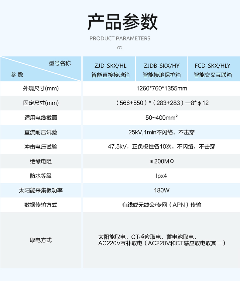 Ø取电方式亘补:装置采用太阳能取电方式外,还可采用CT感应取电或AC220V进行亘补供电,提高产品的可靠性 与多样性。