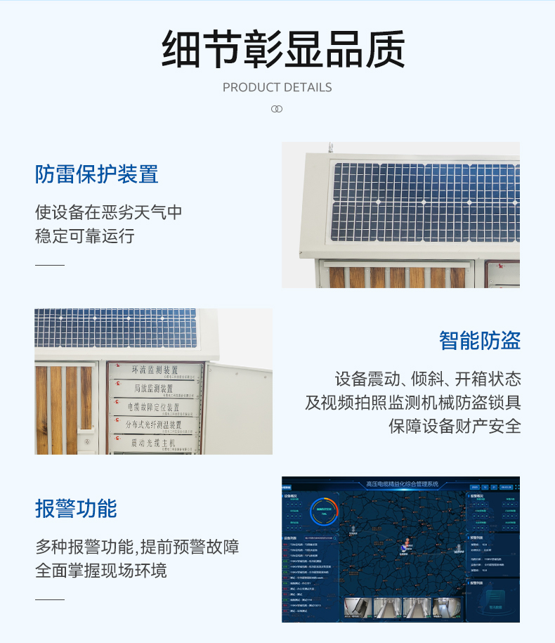 Ø电缆系统综合监控终端具备:环流监测、局放监测、电缆表温监测、光纤震动防外破、接地线防盗割、故障定位、分布式光纤测温、接头线芯测温、开箱报警、图像监测、自动灭火等功能于—体,功能全面。